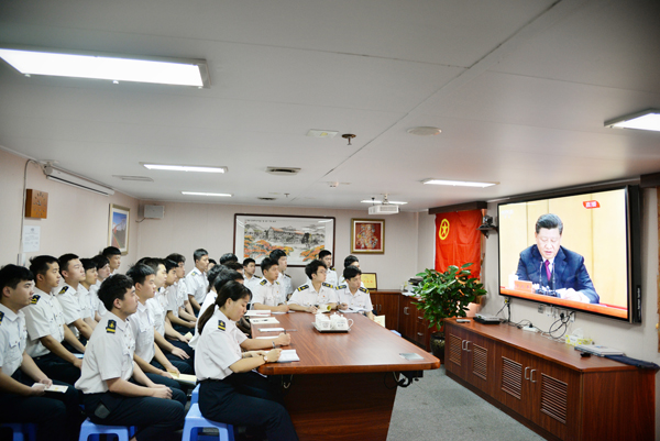 “第一次在‘育德’轮上收看直播,总书记的讲话让我们充满了力量”,正随“育德”轮海上实习的航海学院王广新同学说:“身处新时代,每个人都恰逢其时、重任在肩。作为新时代青年,要接过历史的接力棒,以青春之我、奋斗之我建功立业,为实现中华民族伟大复兴的中国梦而奋斗。”
