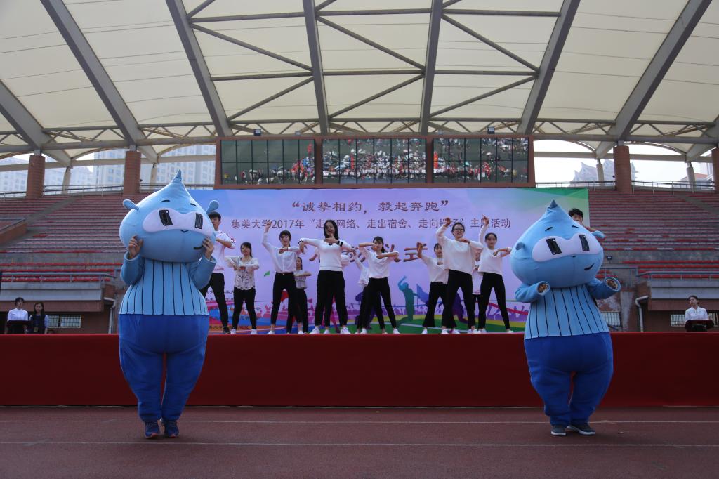 启动仪式主要分为主题表演和主题游戏两个部分。在主题表演的环节中,校学生丑小鸭时装社的同学们身着运动服装,以走秀的形式为大家演绎了参与户外体育运动的青春魅力;校学生会舞蹈队的同学用改编的集美大学“三走”主题曲《大王叫我来三走》和自己编排的舞蹈带领同学进行运动前的热身。在主题游戏的环节中,校学生会的同学策划了“我与团团合个影”活动。启动仪式上,校团委向全校团员青年发出号召,号召同学们将参与“三走”和倡导健康的生活方式结合起来;将强健体魄同坚定理想信念结合起来”。教师代表董立功老师引经据典,告诉同学们参加体育运动不只是为“小我”,更是为“大我”,良好的体质是承担历史使命的基础和根本。