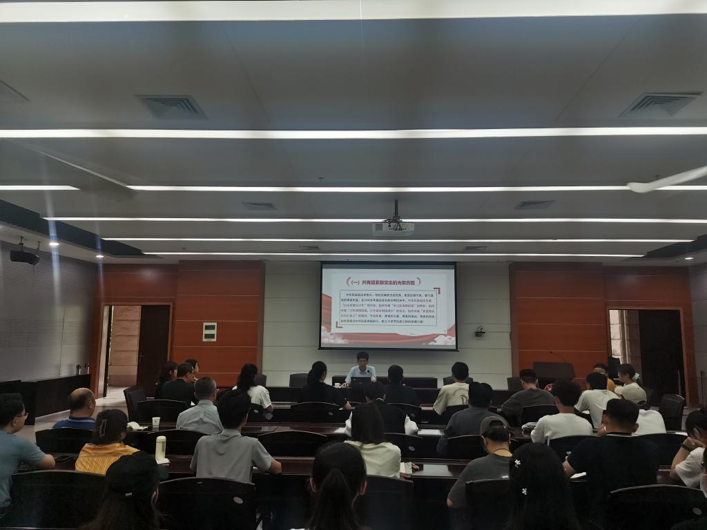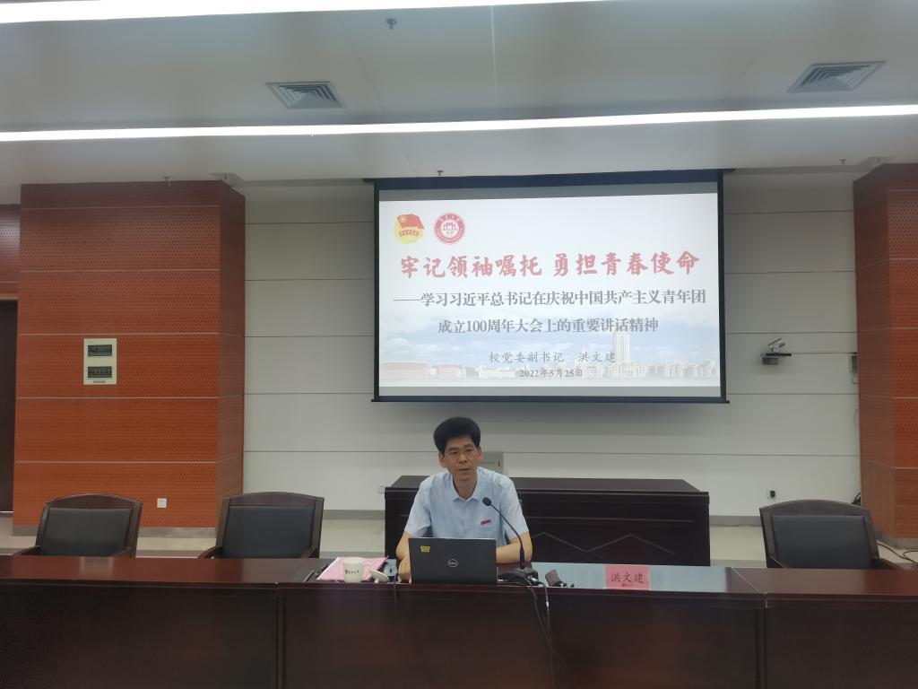 5月25日下午,校党委副书记洪文建以《牢记领袖嘱托 勇担青春使命——学习习近平总书记在庆祝中国共产主义青年团成立100周年大会上重要讲话精神》为题,在尚大楼108会议室为校院团学干部上了一堂精彩生动的思政课。校团委党员干部、校学生会组织主要骨干、“青马工程”学员代表和各学院团支书代表参加了思政课。